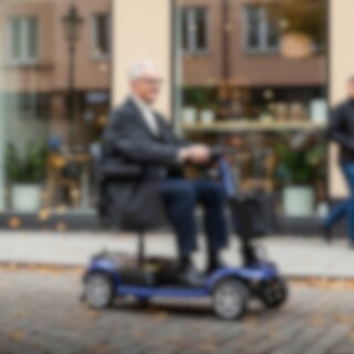 Liten och smidig fyrhjulig promenadscooter med Litiumbatteri och solida däck som lämpar sig väl för att göra ärenden i närområdet.