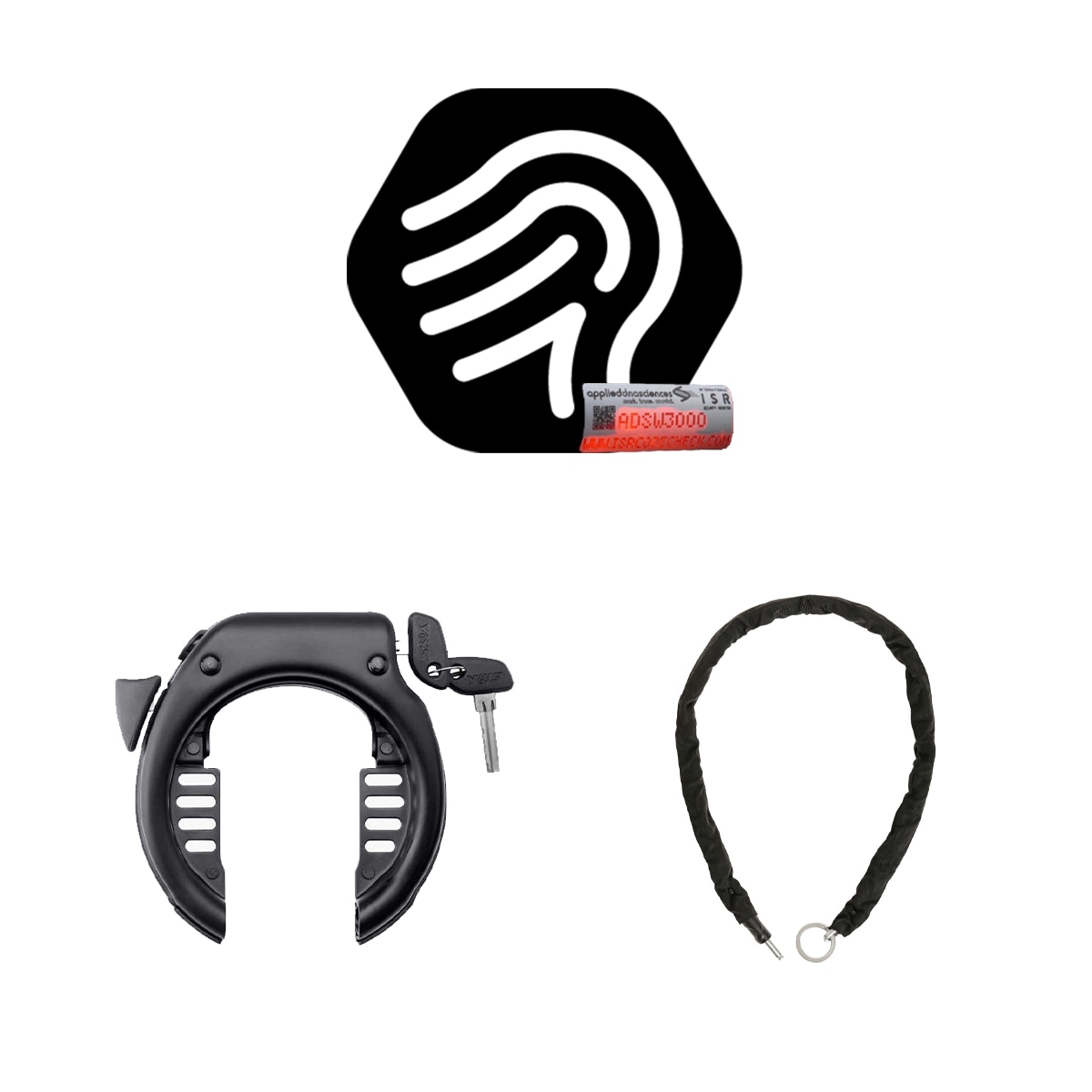 Säkerhetspaketet med försäkringsgodkänt ringlås och låskätting från YWS tillsammans med SmartDNAs ISR-märkning stöldskydd inklusive 1 års trygghetsförsäkring hos SmartDNA.