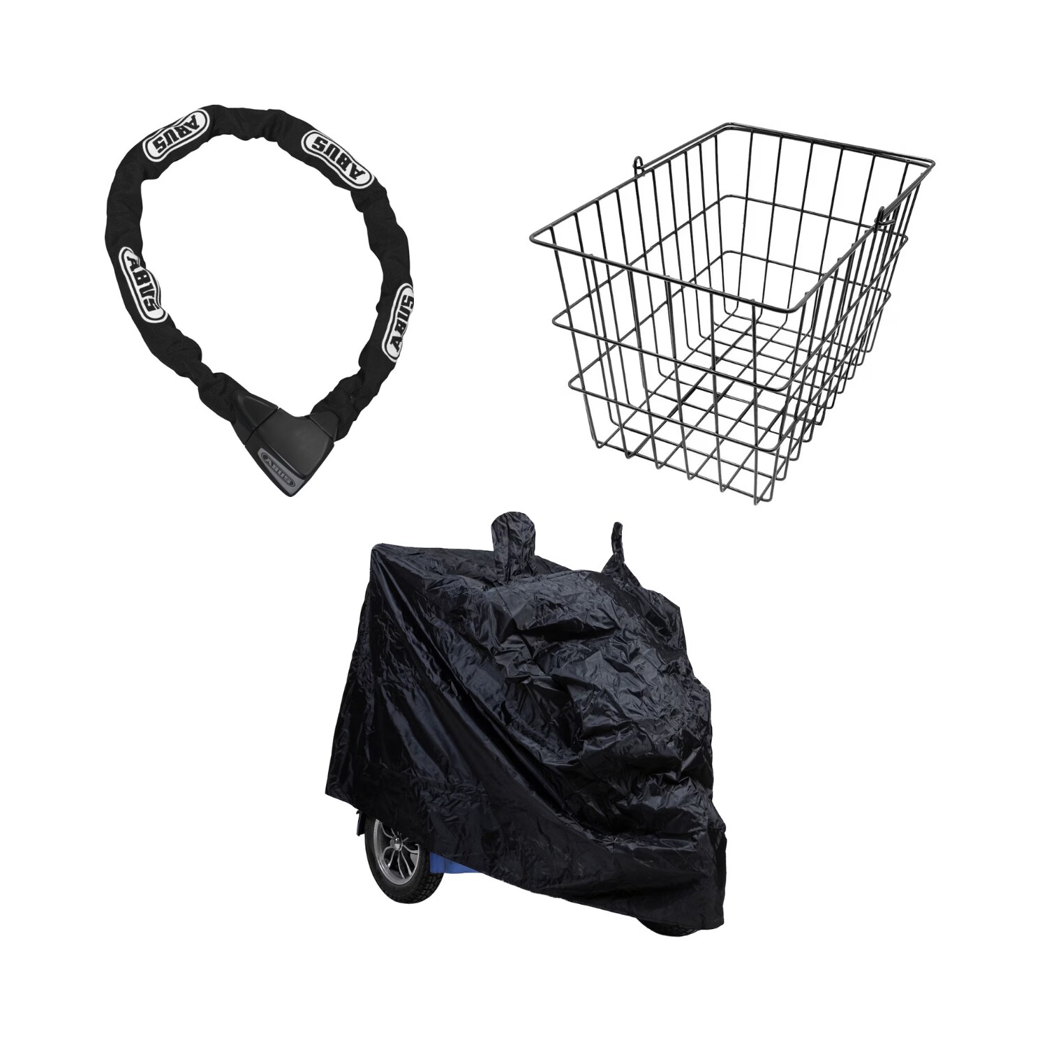Paket med tillbehör till Blimo Moto och Blimo Moto Sport med skyddsöverdrag, bakkorg och kättinglås.